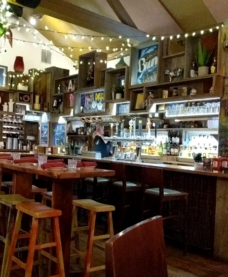 Local art covers the walls of the dining area in this community-oriented restaurant.